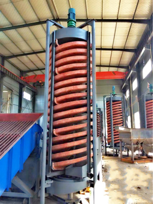旋转螺旋溜槽综合了螺旋选矿机、摇床、离心选矿机的特点是选矿厂进行生产、科研的新型重选设备之一。在较深的理论至实践上来讲,它比普通螺溜重选机多了一个“功能”即中心有yi个中低转速,经过研究试验和生产实践证明对着矿浆流向(反时针)有利改善螺旋面上 流膜状态,加强了有用矿物颗粒的回收,主体就是针对螺旋流膜的内缘层流和外缘紊流交汇的中间区域层流和紊流——相当二次回流的中间“零点”位置。它就是由中心转速给于调整起到*定的作用。所以它*般比普通重选机更能回收微细粒。
